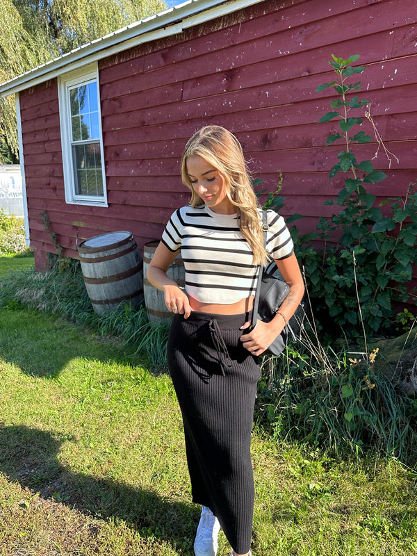 Golden Hour Knit Midi Skirt - Small / Black is backordered and will ship as soon as it is back in stock.