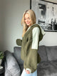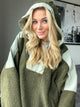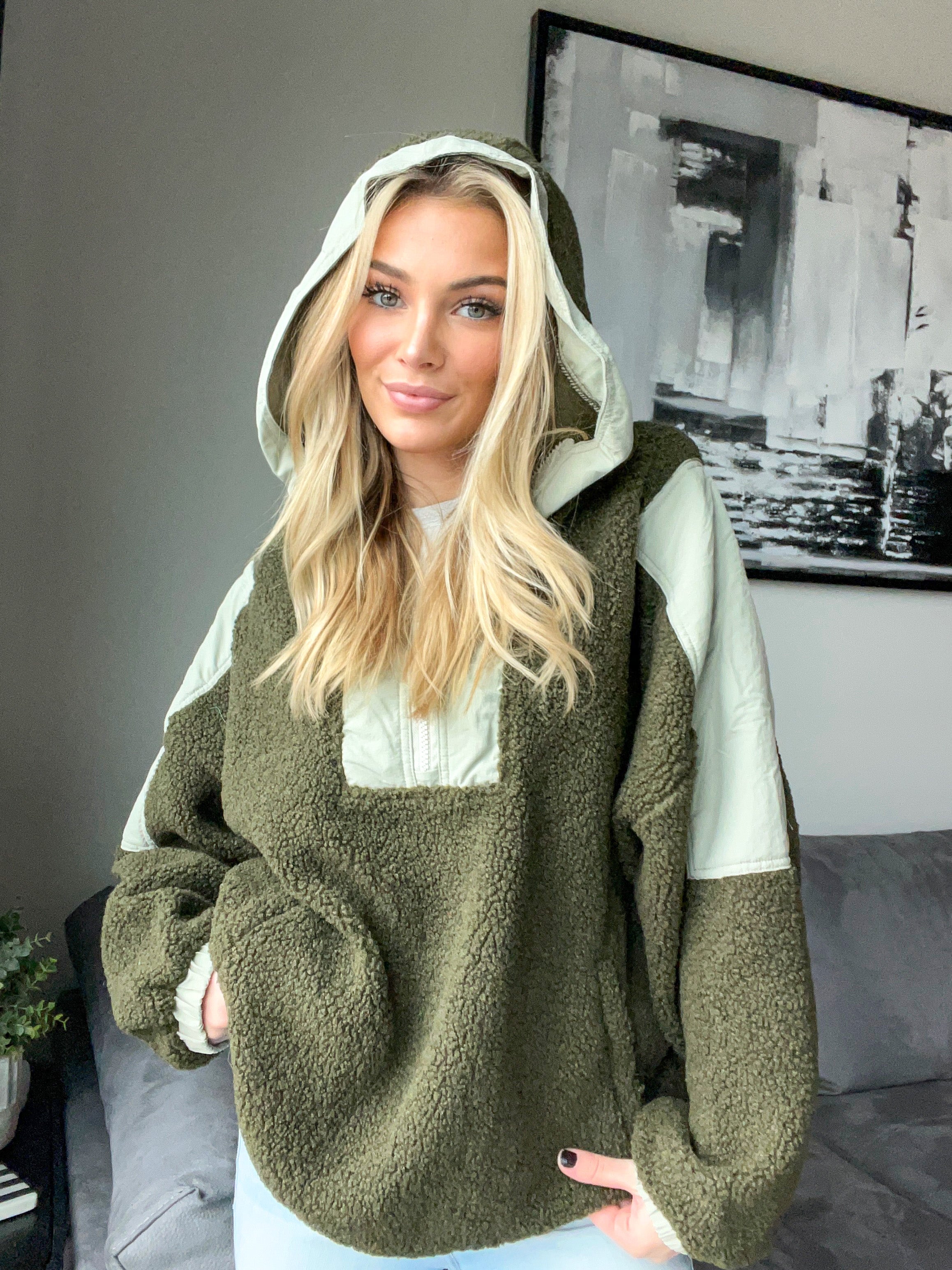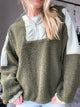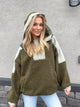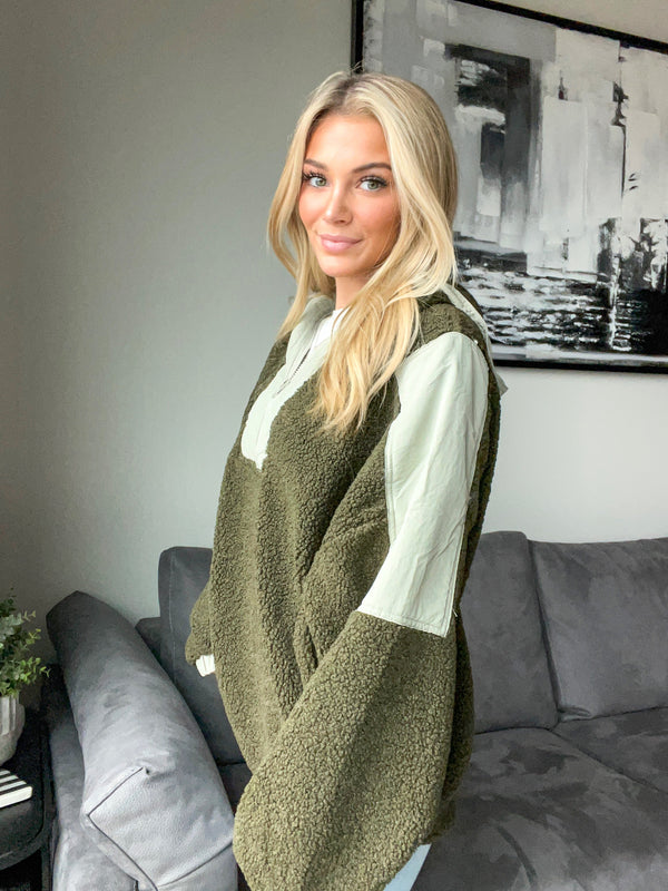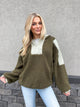 Color Blocked Half Zip Olive-Sage Hooded Sherpa Pullover